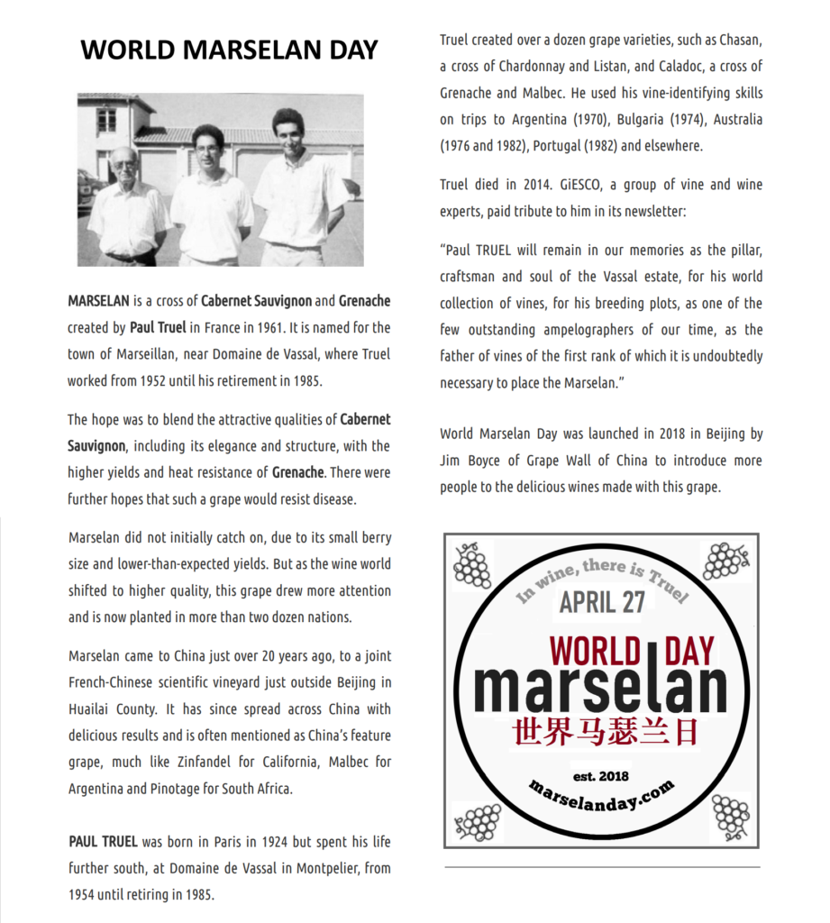 (Get the free Grape Wall newsletter here. Follow on LinkedIn, Instagram, Facebook and Twitter. Grape Wall has no sponsors: help support the mission, including World Marselan Day via PayPal, WeChat or Alipay. Contact Grape Wall at grapewallofchina (at) gmail.com.)